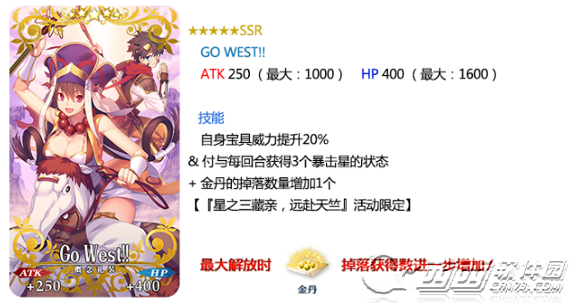 自身宝具威力提升20%&付与每回合获得3个暴击星的状态+金丹的掉落数量增加1个