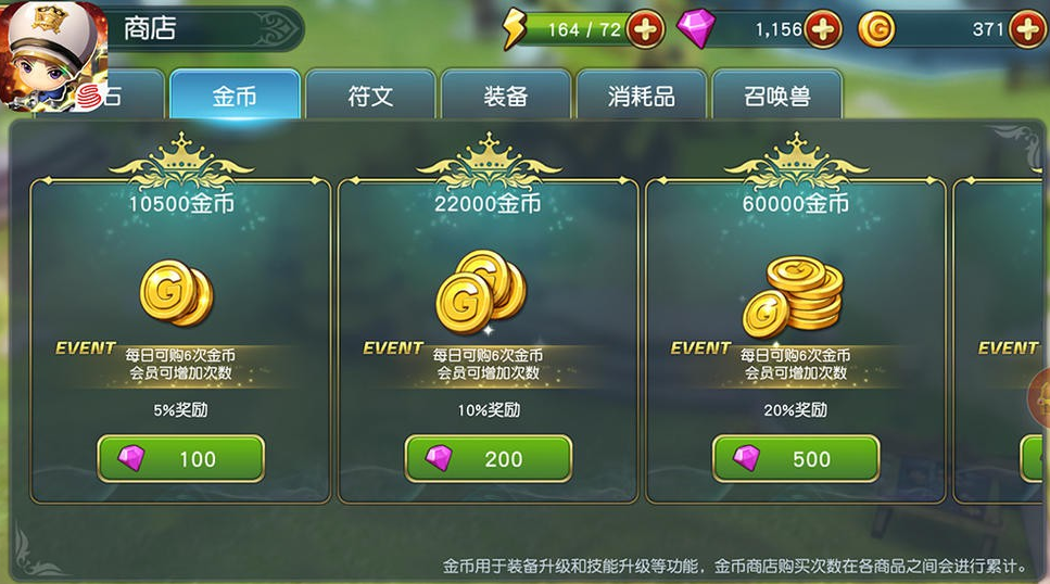 当然了,不得不说最快的获取金币的办法就是用钻石去商店兑换金币了。不过换金币也是有讲究的哦,在商店里面兑换金币是有折扣奖励的,而如果在需要使用金币时发现缺少而选择直接兑换的话,是没有折扣的,请务必注意这一点。