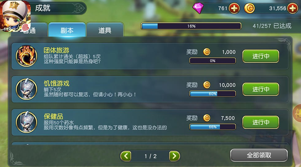 游戏中有三类成就:普通、副本、道具。普通成就覆盖游戏的方方面面:等级、战力、好友数量、公会等等;副本成就包括副本行为:通关某阶段性副本、喝药次数、愤怒次数、躺下次数等等;道具成就即对道具操作的成就:分解装备、升级装备、进化装备等等。成就达成就有金币钻石等各种奖励,并且奖励十分丰厚哦。