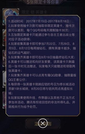 五张英雄卡金额参加7月22日、7月29日、8月5日、8月12日每周抽钻石,拥有的英雄卡越多,抽钻石的运气会越好哦。