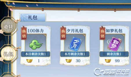 现在有两个礼包,【夕月】是月卡,售价30rmb,一天1rmb,每天50金叶子。