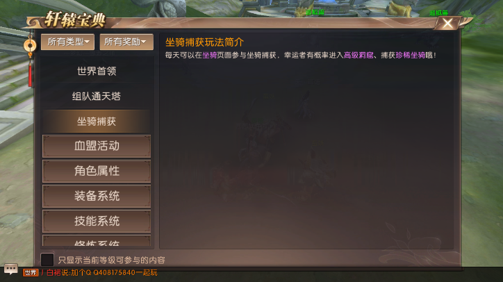1、28级时,会开启坐骑捕获系统,每天有一次免费的机会捕获坐骑,每次捕获都会增加幸运值,幸运值满时,会有一次捕获高级坐骑的机会,但幸运值会清零。提示:并不是幸运值越高,捕获高级坐骑机会越高。