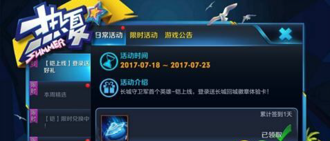 玩家在7月18日-7月23日期间登录,就可领取一个有限期3天的长城回城徽章。