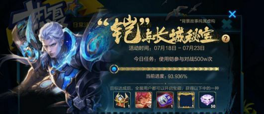 7月18日-23日活动期间,每天会更新一个世界任务,只要王者荣耀英雄铠总出场次数达到500万次,所有玩家就可以获得铠的羁绊宝箱,内含:花木兰、露娜以及所有皮肤,永久英雄花木兰、长城头像框、改名卡、30钻石。