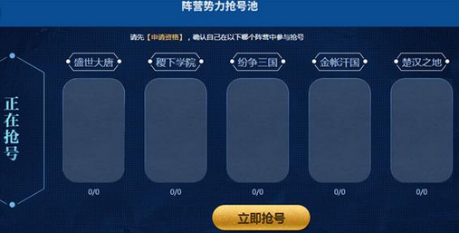 抢号池有盛世大唐、稷下学院、纷争三国、金帐汗国和楚汉之地5个阵营,玩家只能抢自己阵营的,只要提示你抢号成功就代表你已经抢到白名单。