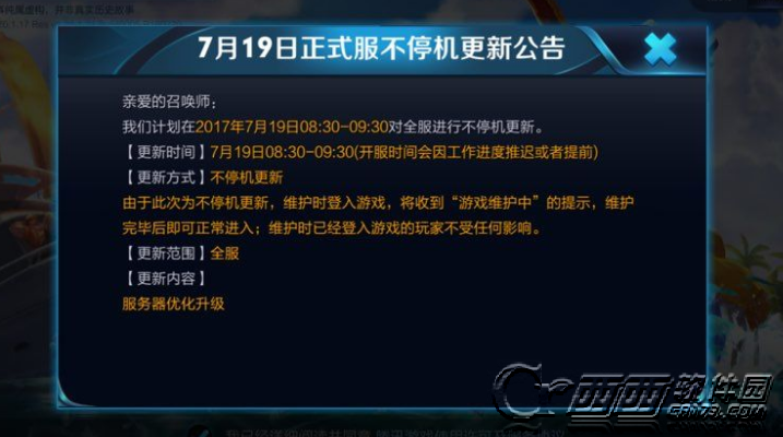 我们计划在2017年7月19日08:30-09:30对全服进行不停机更新。
