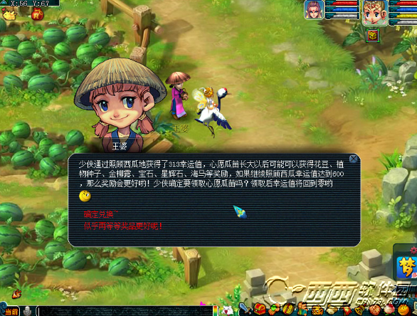 特色玩法,活动期间,角色等级≥50级的单人玩家可以前往江南野外(54,65)或西梁女国(108,17)处的西瓜地里照顾西瓜,通过为西瓜浇水、施肥、除虫和翻土,可以随机获得一定的幸运值。积累幸运值可以在江南野外(53,71)或西梁女国(111,25)处寻找王婆用幸运值兑换心愿瓜苗,种下后即可获得丰富奖励!