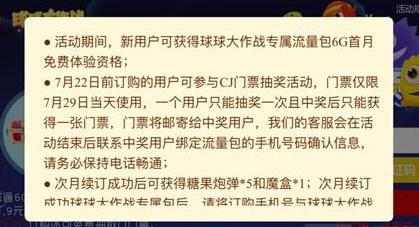 联通6G联通流量包免费领,首月0元,次月起自动续订,9元/月;续订享有球球豪华礼包,现在起至7月22日订购还可免费抽取CJ门票。