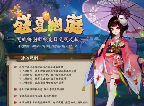 阴阳师盛夏幽庭皮肤碎片怎么获得?盛夏幽庭拼图怎么获得?阴阳师近期开放新的庭院皮肤盛夏幽庭,玩家需要完成拼图才能解锁阴阳师盛夏幽庭庭院皮肤,那么盛夏幽庭拼图怎么获得?盛夏幽庭皮肤碎片怎么获得?一起来看看。