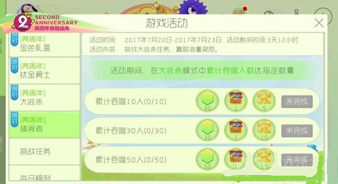 累计吞噬30人,可得彩豆*30,圣衣材料箱*1,两周年活动集字*10;