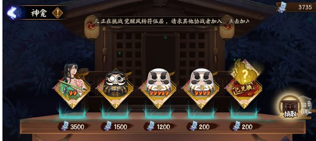 ⑤御魂礼盒:花费200御札可兑换指定位置指定种类的6星御魂1枚,每个周期限定最多兑换5枚。(会出现在世界频道上面喊“功夫不负有心人”)