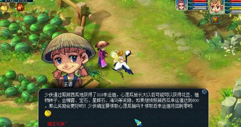 活动期间,角色等级≥50级的单人玩家可以前往江南野外(54,65)或西梁女国(108,17)处的西瓜地里照顾西瓜,通过为西瓜浇水、施肥、除虫和翻土,可以随机获得一定的幸运值。积累幸运值可以在江南野外(53,71)或西梁女国(111,25)处寻找王婆用幸运值兑换心愿瓜苗,种下后即可获得丰富奖励!
