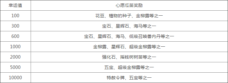 积累更多幸运值,兑换的心愿瓜苗可种出不同的奖励,具体奖励情况如下: