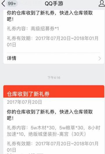 礼包有50000木材*30、50000粮草*30、8小时加速*10和绝版城堡皮肤离宫30天。