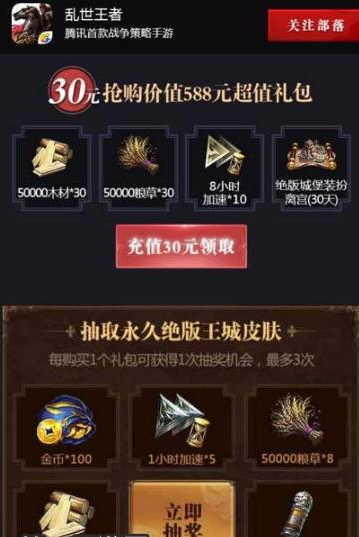 乱世王者30元抽抢购绝版皮肤礼包值吗?乱世王者30元抢购价值588元超值礼包能开出什么。游戏推出30元抢购绝版王城皮肤-离宫城堡皮肤,那能能抽到绝版王城皮肤离宫城堡皮肤吗,想必大家也想知道到是否值,为此西西带来解答,赶紧去看看吧