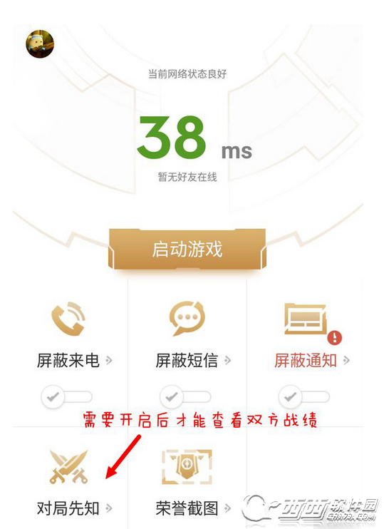 选择辅助选项后,不仅可以看到当前网络状态,还提供了五种功能:屏蔽来电、短信、通知、对局先知以及查看荣誉截图,小伙伴们可以凭自己喜好选择是否开启这些功能