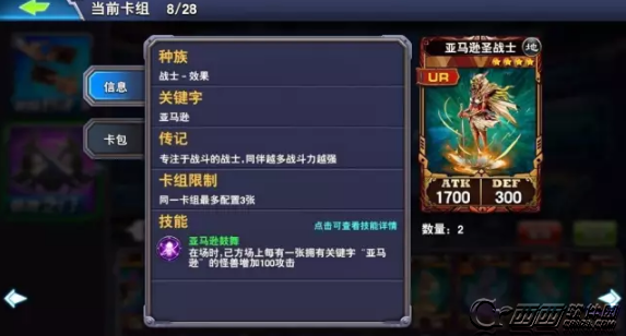亚马逊圣战士:毋庸置疑,亚马逊卡组的核心,高强度战斗力,配合场上亚马逊怪物还能提升攻击力,单卡质量最高,战场铺怪的核心主力,首选。