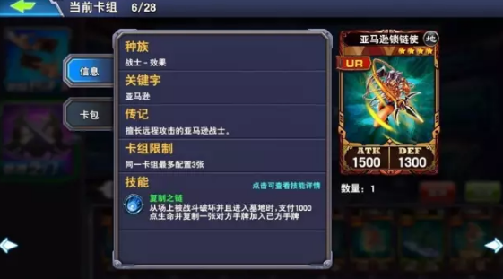 亚马逊锁链使:死亡获取对方手牌一张,有种“以彼之道还施彼身”之感,起手拿到就上吧,能够影响对手出牌思路,战略意义突出,当然,偷卡的质量上限和下限都很大,存在很强的不稳定性,建议1-2张。