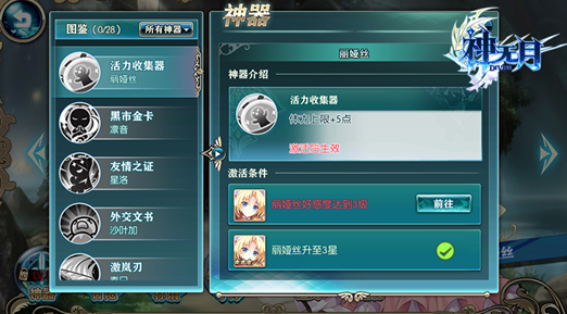 其中神器是比较好解锁的,好感度3级就可以。每个角色的神器是不同的哦