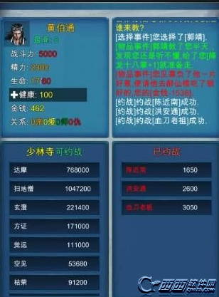 6.葵花宝典太贵,不实用。为了拿洗髓经我约了无数次达摩,后来他忍无可忍主动约我,到最后我还是没拿到洗髓经,太憋屈了。武功在游戏里就只是战斗力,有点单调了。建议点开武功之后能看到详细介绍,既能科普武侠知识又能丰富游戏内容。武功练大成之后如果能有技能就好了,比如说九阳神功练成之后能减少别的武功的修炼消耗,北冥神功能在战斗后按比例吸收对手战斗力,易筋经能续命,九阴真经能提高其他武功掉率之类的。还有练了葵花宝典之后就无法结婚,这是必须的。随机剧情要是能在多点就好了。