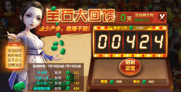在登陆签到等活动中获取绿宝石之后,不要立即消费掉,注意观察右上角的“宝石大回馈”活动,如下图:
