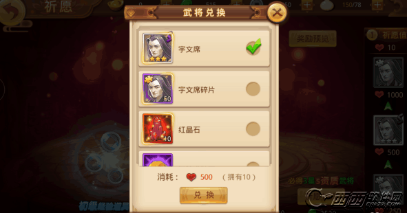 可以通过高级祈愿来获取祈愿值兑换宇文席,十连必得3星S武将,还可获取100点祈愿值,500点祈愿值即可兑换完整的三星S级宇文席,作为防御类的武将,宇文席是非常顶级的神卡。