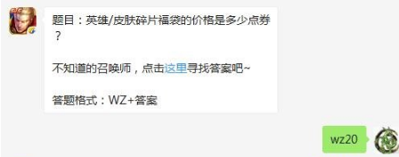 题目:英雄/皮肤碎片福袋的价格是多少点券?(答题格式:WZ+答案。如你的答案是,则回复:wz答案。)