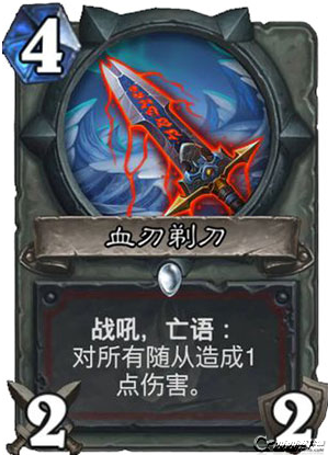 血刃剃刀费4,攻击耐久是2.是一张战士职业的白卡。效果是战吼,可以对所有的随从造成1点伤害。
