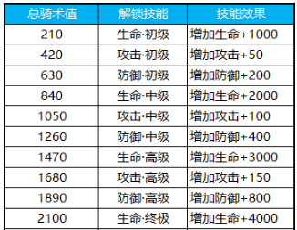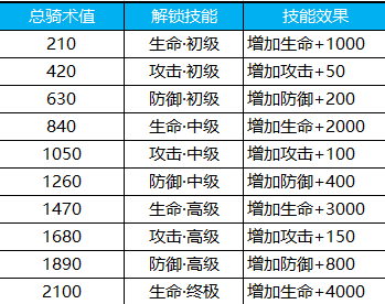 坐骑的资质不同,提升灵气等级后提升的骑术值也有所区别。当总骑术值(即所有坐骑的当前骑术值总和)达到一定的值时,可以解锁相应的坐骑技能。坐骑的技能可以有效提高角色的基础属性。