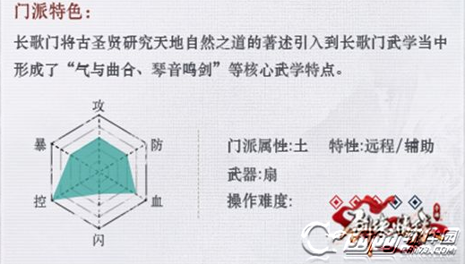 从官网门派界面的六维属性图中可以看到,长歌门派的整体属性偏向于控制,血量。攻击和防御一般,闪避和暴击较为劣势。