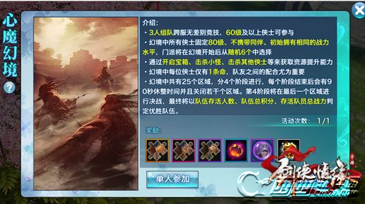 幻境中所有侠士固定80级、不携带同伴、初始拥有相同的战力水平,门派将在幻境开始后从随机6个中选择。