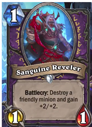 术士职业白卡,1费,1-1。战吼:消灭一个友方随从并获得+2/+2。
