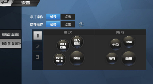 上面大家可以看到,靠打操作和防守操作是分长按或者点击的。意思就是说,如果玩家选择长按,玩家就需要一直长按靠打或者防守才能保持动作,当长按松开了,就会取消动作。而点击就是当你点击了靠打或者防守后,就会一直自动保持当前操作,再次点击时就取消。