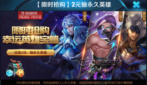 7月28日开启的2元抽英雄活动中,可以得到的永久英雄分别是诸葛亮、兰陵王、夏侯惇。