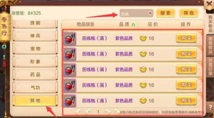 可在售卖里买其他玩家寄售的历练瓶(历练可以使用空的历练瓶提取,然后通过售卖寄售给其他玩家);