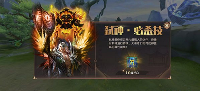 在手游中,当天命者到达10级时,就可以开启弑神任务,完成弑神任务获得弑神之力,开启弑神系统,获得更强有力的作战伙伴。届时,还可以通过打开游戏界面中的技能面板,察看自已的弑神,而且每个职业都有专属的弑神。