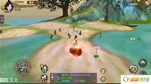接下来,我们沿着山边一直走,很快便来到了九曲河,这里有一大批游荡蟹怪,渡口还有两艘小舟。沿着河道继续往里深入,不多时就能在最尽头的一艘船边看到一片桃花。它是我们今天故事即将走进尾声的先奏曲“零落成泥碾作尘”(图中⑥所在位置)。