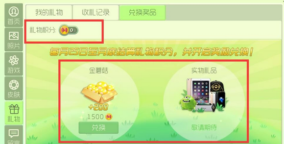 被赠送礼物时,有机会在每月25日额外获得礼物积分结算。每月25日至月底,可以用礼物积分兑换金蘑菇、实物奖励(即将开放)等丰厚奖励。