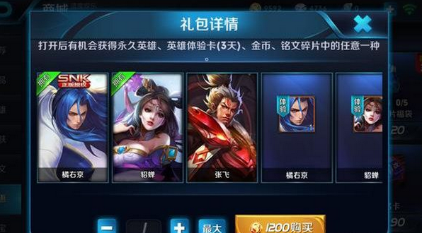 王者荣耀于今日开启了新一轮的1200金币幸运英雄宝箱,此次宝箱的三位永久英雄分别是橘右京、貂蝉和张飞,其中橘右京是SNK非卖英雄,因此还未集齐的小伙伴别错过了,当然这次活动的推出意味着新英雄的上线,这种消耗金币的套路大家都是很熟悉的,选择开宝箱还是踏踏实实攒金币买新英雄全凭个人喜好!