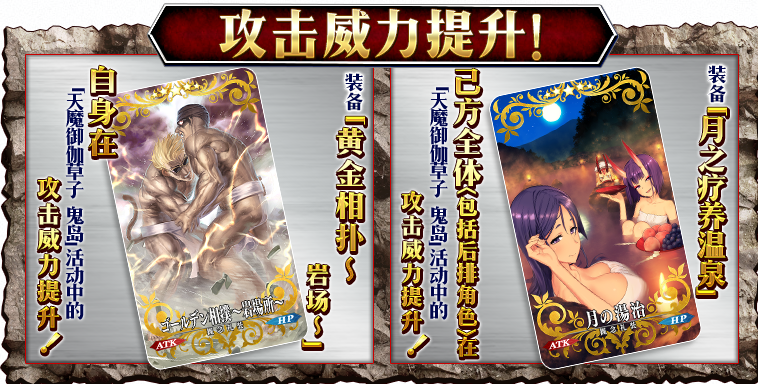 此外,通过装备活动限定概念礼装『月之疗养温泉』(伤害点数奖励及关卡奖励),可以提升己方全体(包含替补)在『天魔御伽草子 鬼岛』中的攻击威力。