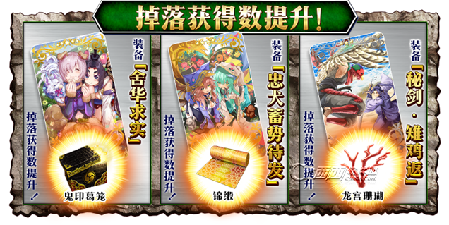装备限时概念礼装,可以提升活动专用道具『鬼印葛笼』『锦缎』『龙宫珊瑚』的获得数量。