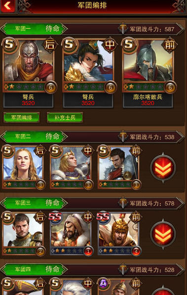 游戏中有一个羁绊系统,也就是当某三个英雄同时出现在一个团队时,互相有加成效果。就好比下面这三个英雄,同时出现在一个军团时每个人加成力量。想想就刺激,3个弓兵一轮骑射射掉对方,很厉害!