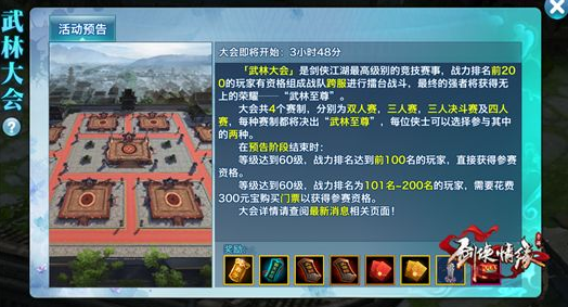 比赛时不可骑马,并屏蔽骑马图标。根据战队伤敌数、剩余同伴数以及伤害量判定胜负。胜平负分别获得3、1、0比赛积分,每种比赛的积分单独记录。且在比赛界面中可以查询各比赛的排名列表,只显示前20名其他少侠与自己。