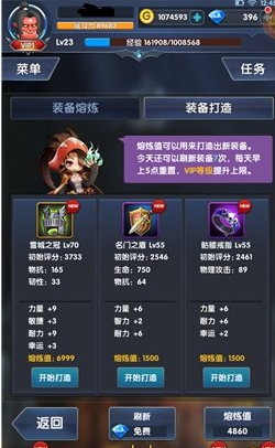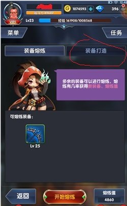 点击背包,进入到熔炼界面,点击红框中的装备打造,装备打造这里有许多评分高的橙色装备,多积攒一些熔炼值,积攒到一定程度就可以兑换极品装备了,平常打怪是爆不出什么好装备的,装备是提升战力的一个关键点。