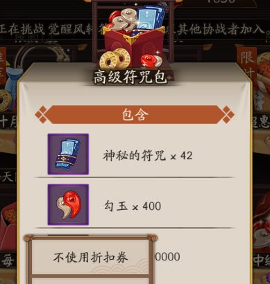在商店→礼包屋→高级符咒包,选择折扣券,原来的648变成了583元。