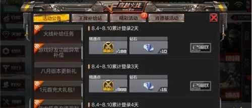 还好上周末新版本更新有很多钻石福利,这个是最爽的福利,不会像手雷一样用一段时间就没了,战友们可以攒下来买自己喜欢的武器。除了更新拿钻石、完成每日任务拿钻石、还有方法拿钻石。从上周五开始一直到这周周四,累计登陆就可以拿钻石,累计登录2天送10钻石,累计3天再送15钻石,累计4天再送20钻石。