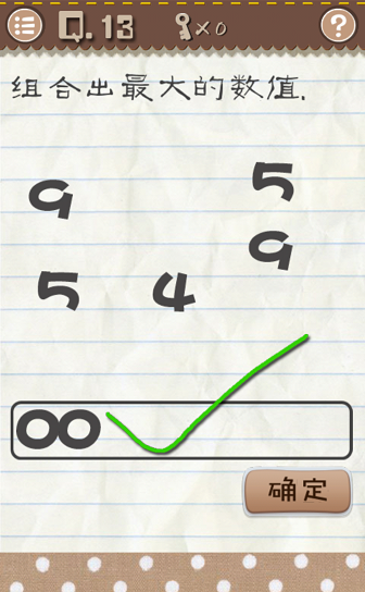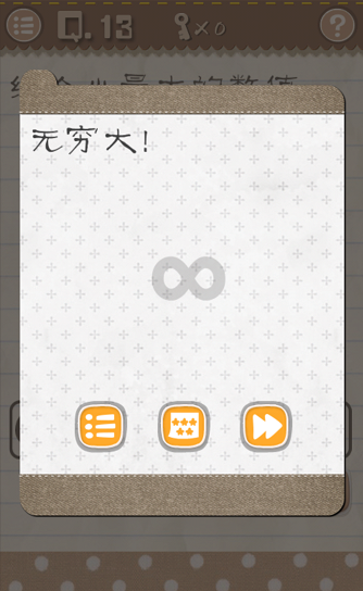 首先进入游戏首界面,点击三角形开始按钮可以进入关卡选择环节,选择第13关进入第13关游戏,游戏内容是要你组合出最大的数值,一定要注意发散思维哦!将2个0左右挨着组合出来的数字就是数学里面经常提到的无穷大,顺利通关!这样的游戏既能够打发时间,又可以锻炼思维能力,刚开始很多玩家肯定会想到最大的数字9开头开始排列,这就是直接导致的误区,引导玩家做出错误的解题方向,所以一直强调要发散思维,不能局限于眼下。