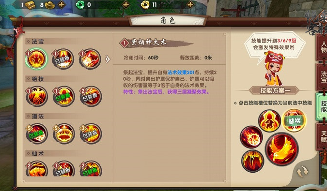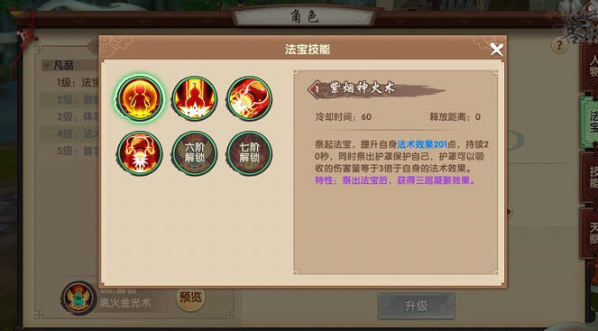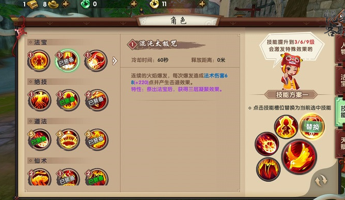 法宝技能优先选择紫烟神火术与混沌太极咒。紫烟神火术使用后会提高自身法术效果并形成法术护罩,即增加了输出又保证了生存,在与对手遭遇时,应首先开出此技能。而混沌太极咒附带的击退效果,对于法师类职业来说,是拉开距离,平稳输出的重要保证。
