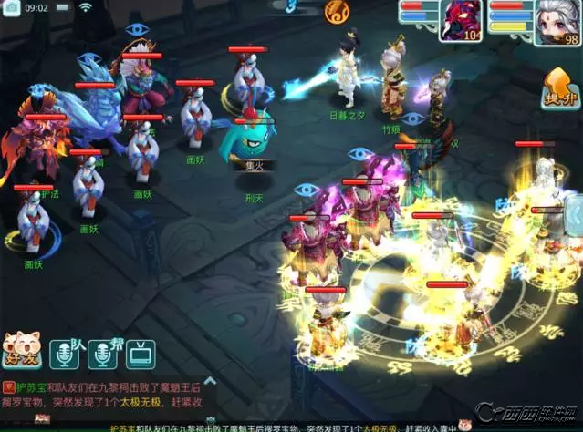 打法介绍:场上怪物除了刑天与左护法为物理伤害,剩下的都为自己仙术伤害,所以我们采取先击杀刑天,五灵封印画妖,适时开启金刚阵法群的打法思路。