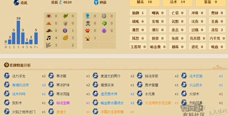 过牌方面,主要通过秘法学家的定向检索和奥术智慧来过牌,再加上寒冰克隆和一张秘法宝典,补牌效果非常强大,足以弥补手牌不足的问题。